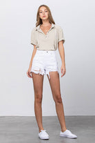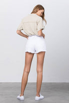 High Rise Denim Shorts 100% COTTON (SIZE S) WAIST 28" HIP 38 1/2" FRONT RISE 11 1/2" LEG OPENING 23" INSEAM 3 1/2" *Model wears size S* MODEL HEIGHT 5'9" WAIST 24" HIPS 35" BUST 34"