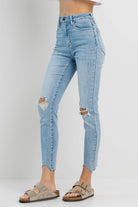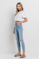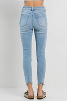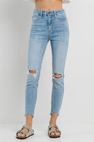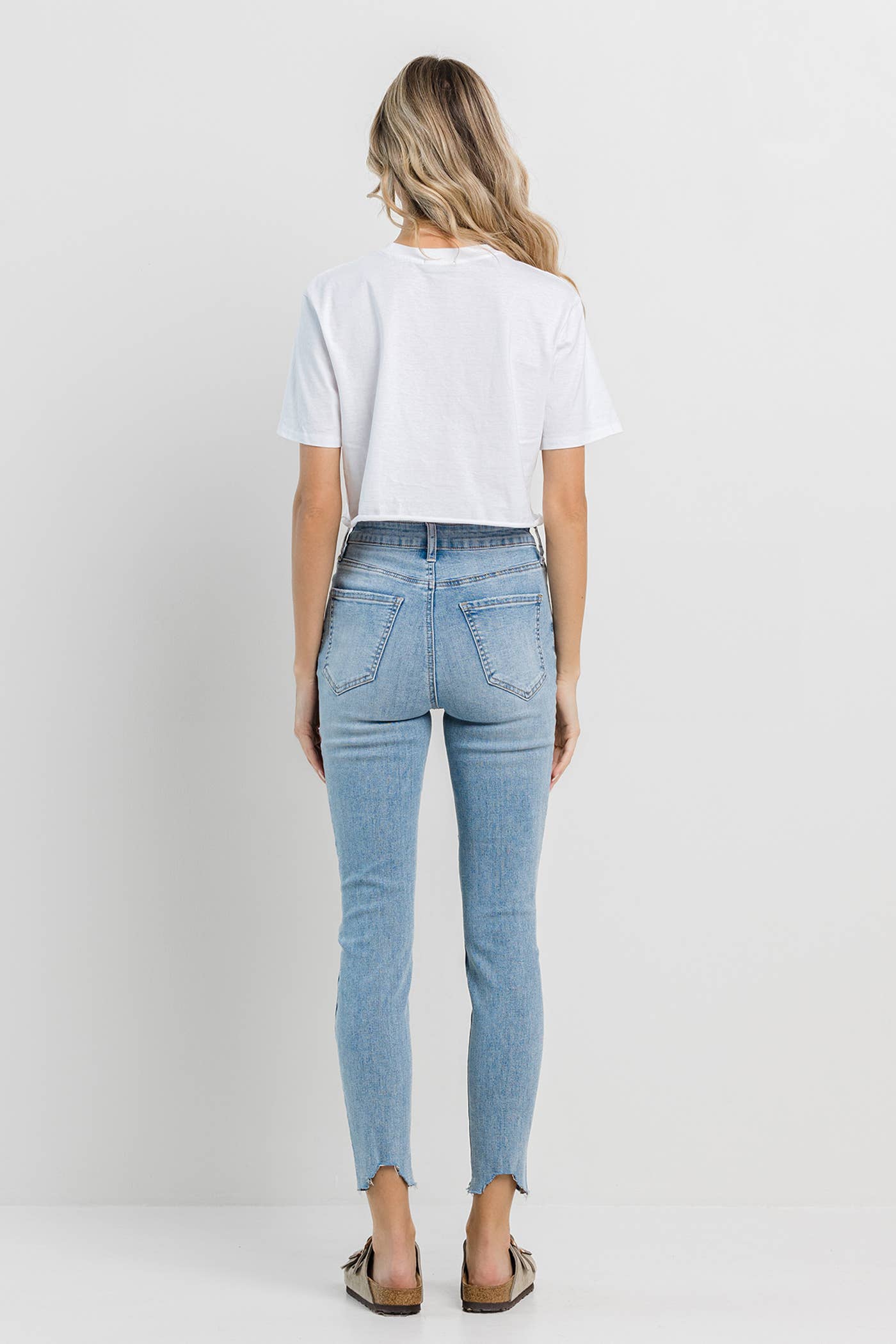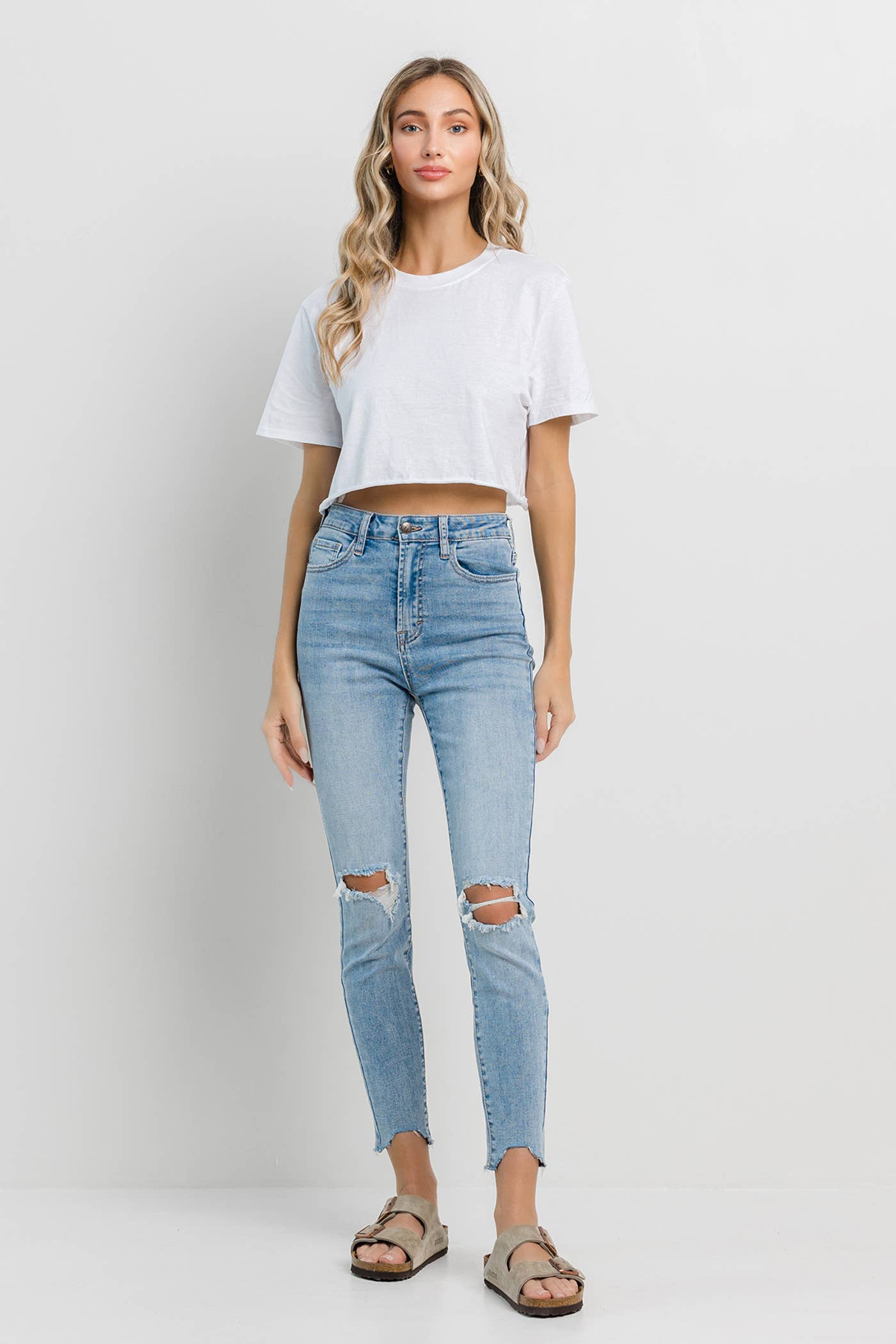Our high rise skinny made with our well-known jelly fabric that is full of stretch & comfort. Detailed with knee blowouts and a shark bite hem.
