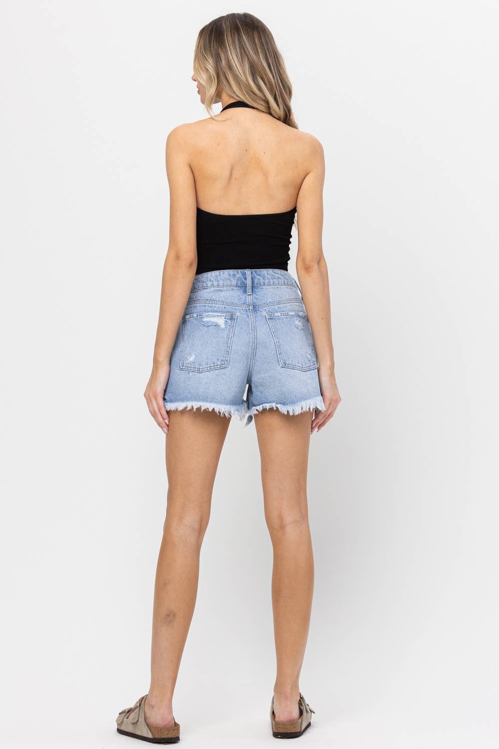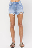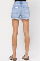 Mid-rise light wash cut hem shorts are a stylish and casual summer staple, featuring a comfortable fit that sits just above the hips. Crafted from soft denim with a light wash finish, they provide a laid-back aesthetic ideal for warm weather. The cut hem adds a trendy, relaxed vibe, often frayed or unfinished for a contemporary touch. These shorts typically include classic elements like five pockets and belt loops, making them versatile for pairing with various tops and footwear, from tank tops to oversized sweaters and sneakers to sandals.