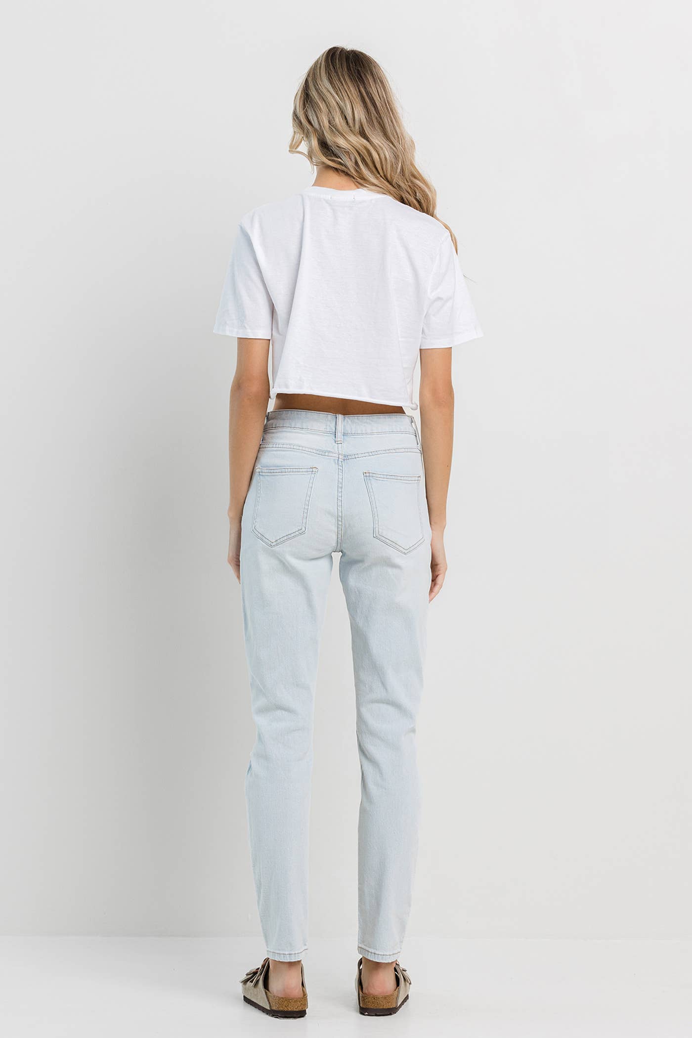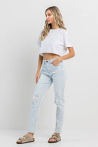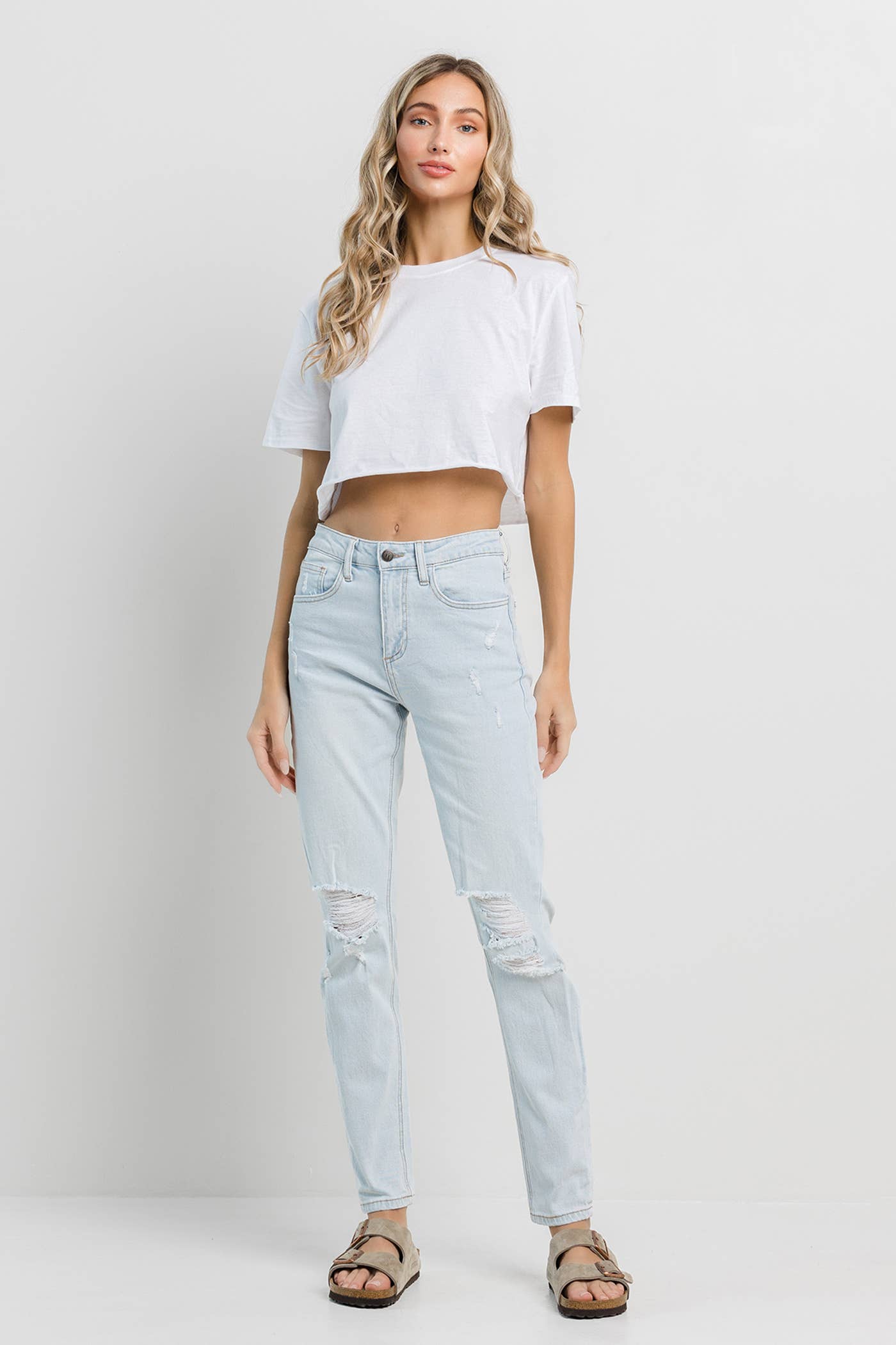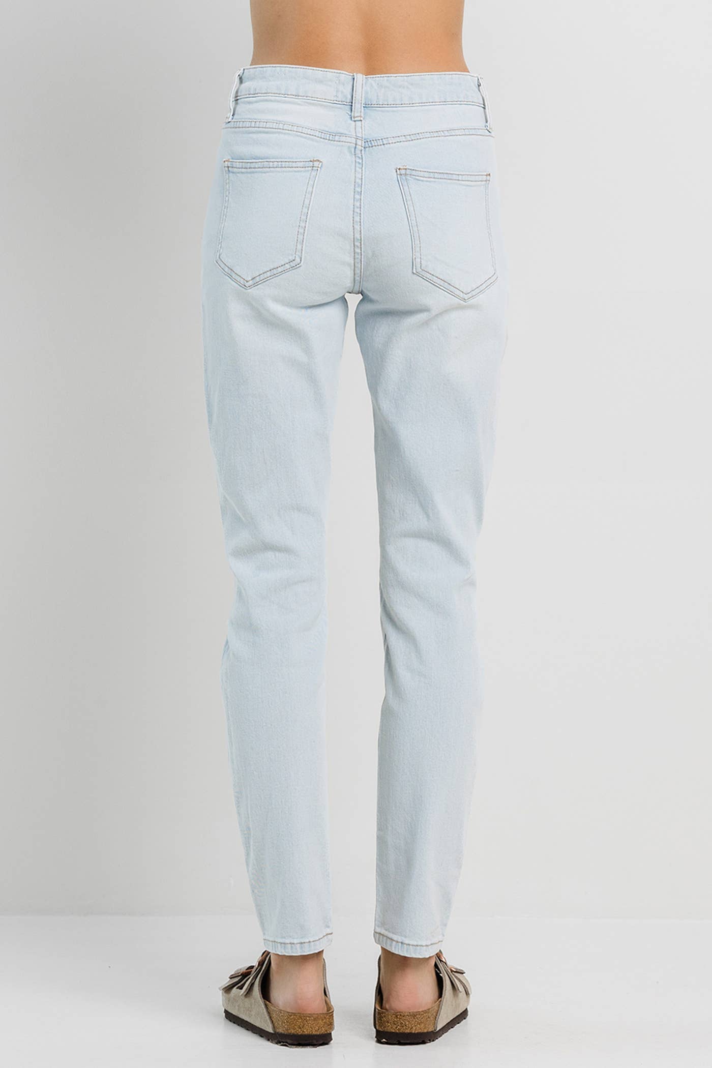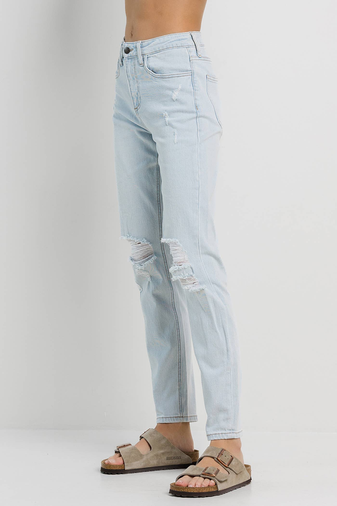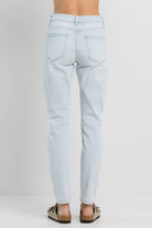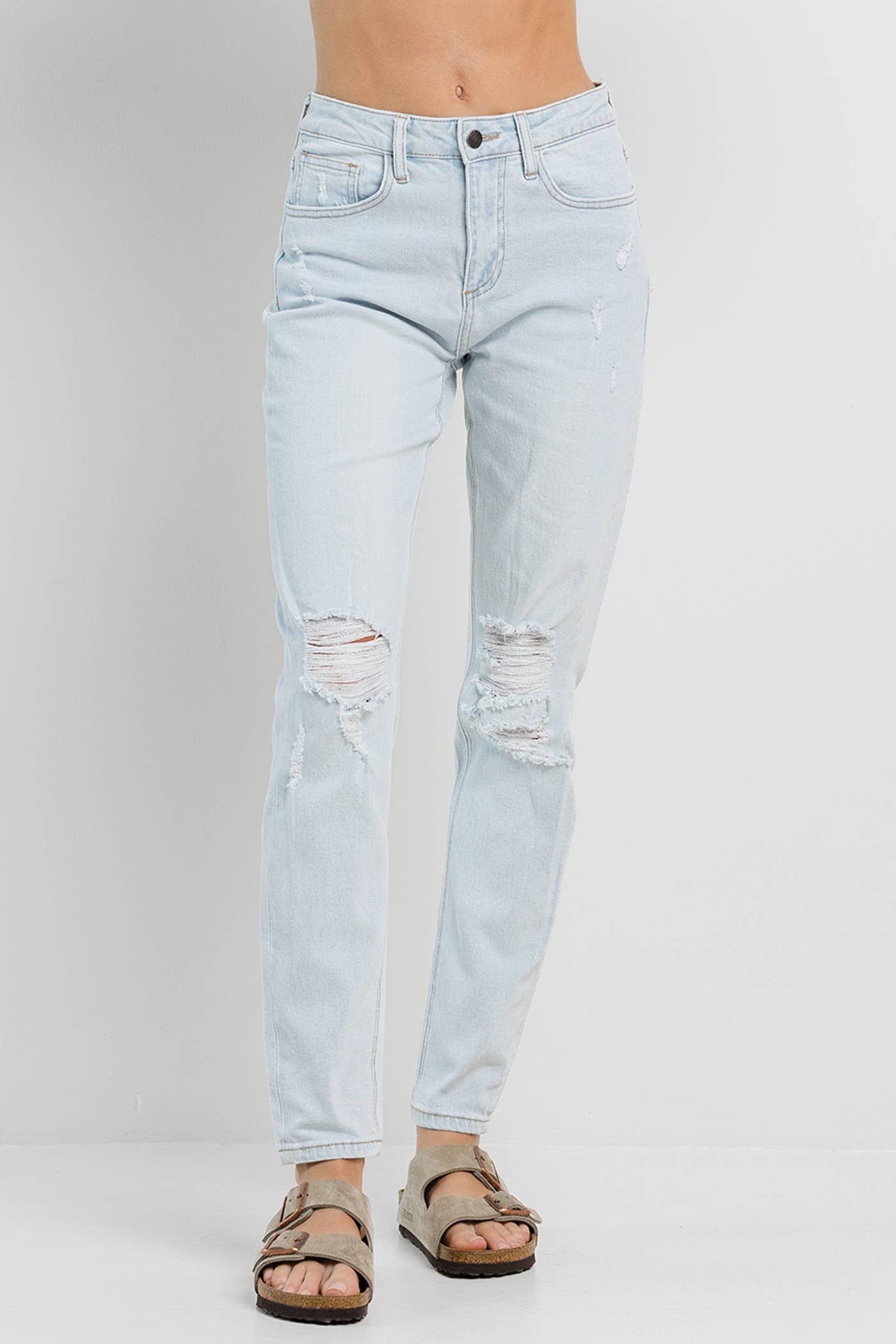 Light blue washed mom jeans detailed with knee rips and a clean hem.