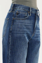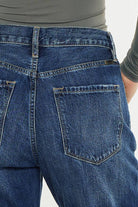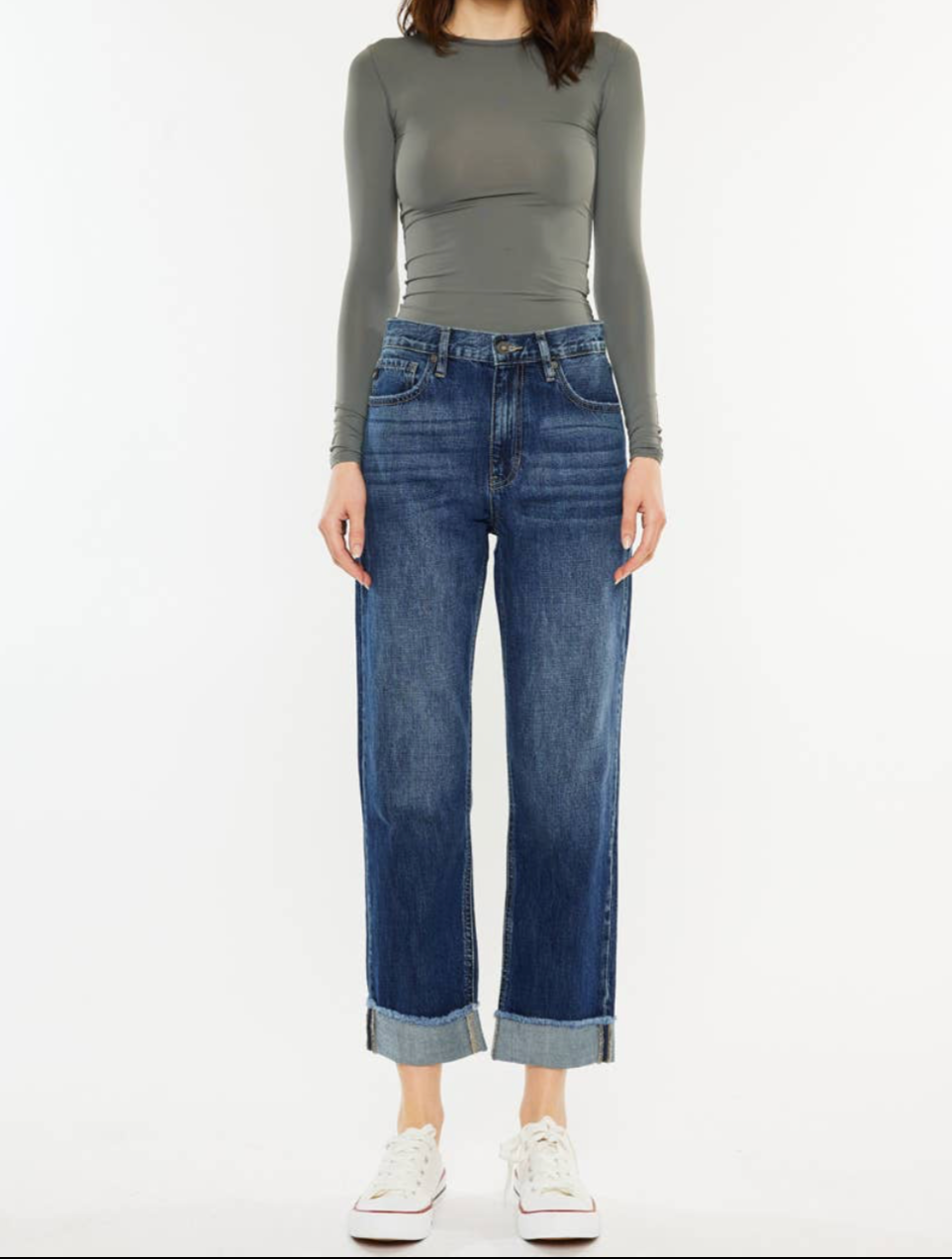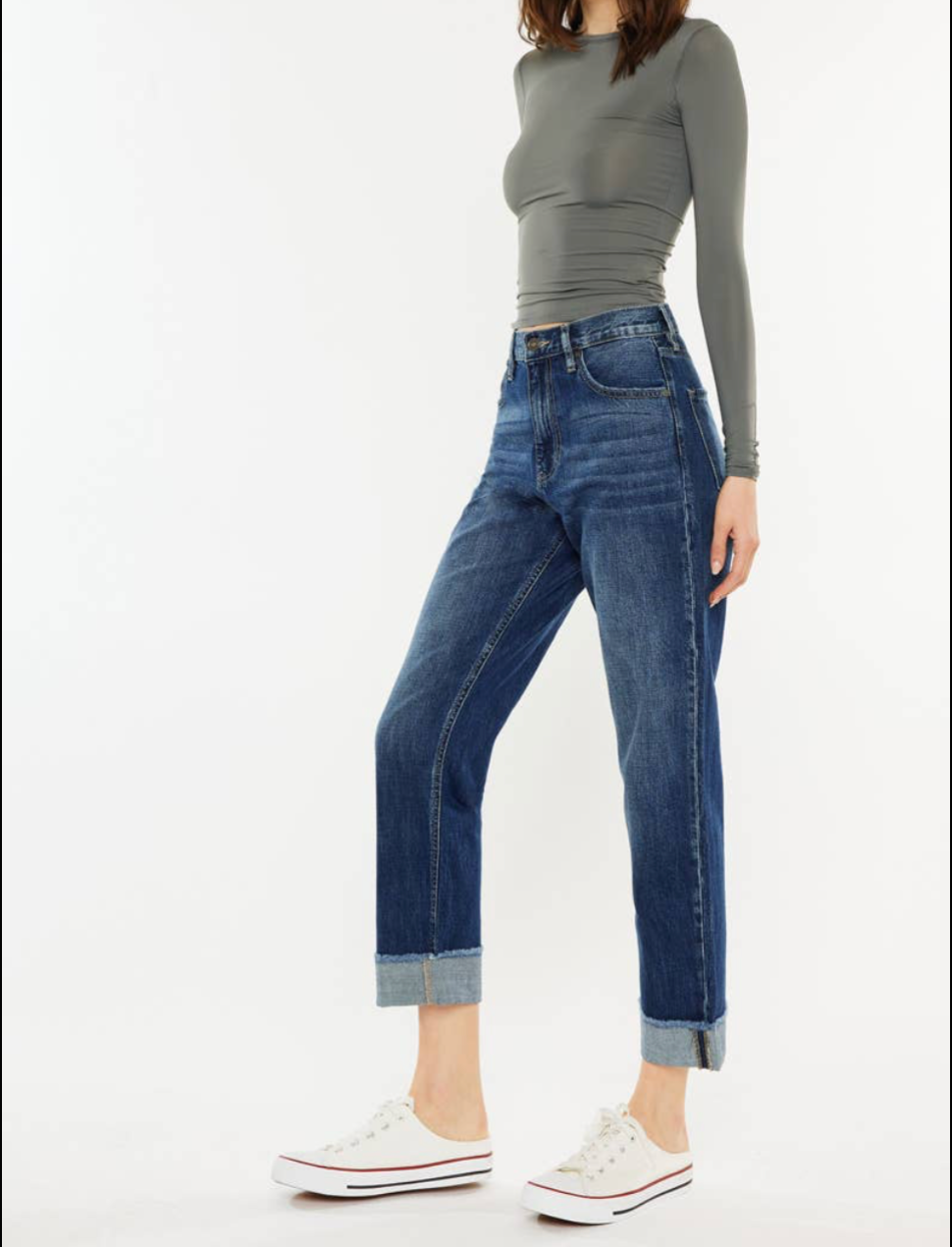 The high rise cuffed straight dark wash rigid open side jeans are a stylish and contemporary denim option, characterized by their elevated waistline that flatters the silhouette while providing a comfortable fit. The dark wash adds a sophisticated touch, making them versatile for both casual and dressy occasions. The rigid fabric offers durability and holds its shape, while the open side detailing adds a unique twist to the classic straight-leg design. Cuffed hems enhance the relaxed vibe, making these jeans a trendy choice for modern wardrobes.