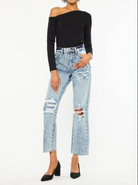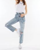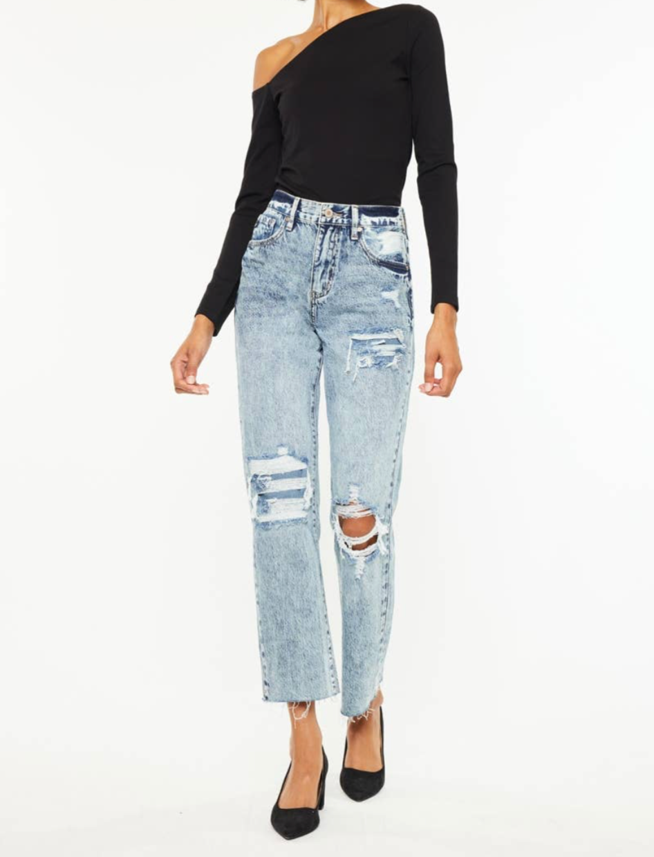 The high-rise straight fit jeans feature a trendy acid wash finish that gives them a vintage vibe, while the rigid denim construction ensures durability and structure. Designed with a classic 5-pocket style, these jeans showcase unique distressing, including patches that add character and a raw hem for an edgy, unfinished look. The zip fly closure offers convenience, making these jeans a stylish choice for casual outings or everyday wear.