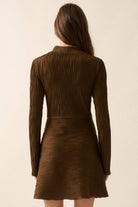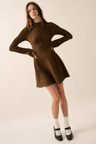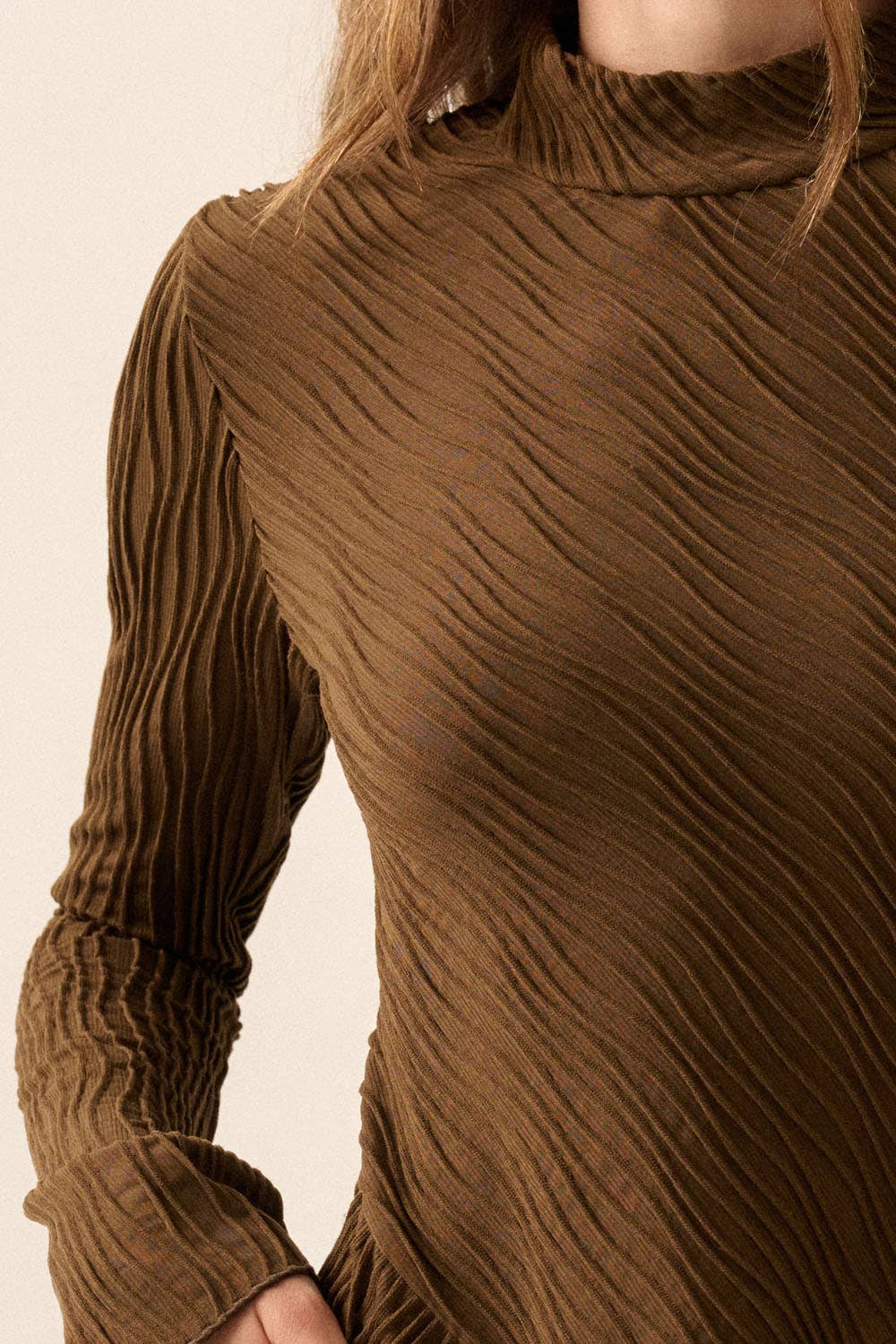 Wavy-Texture Ribbed Knit Mock-Neck Mini Dress