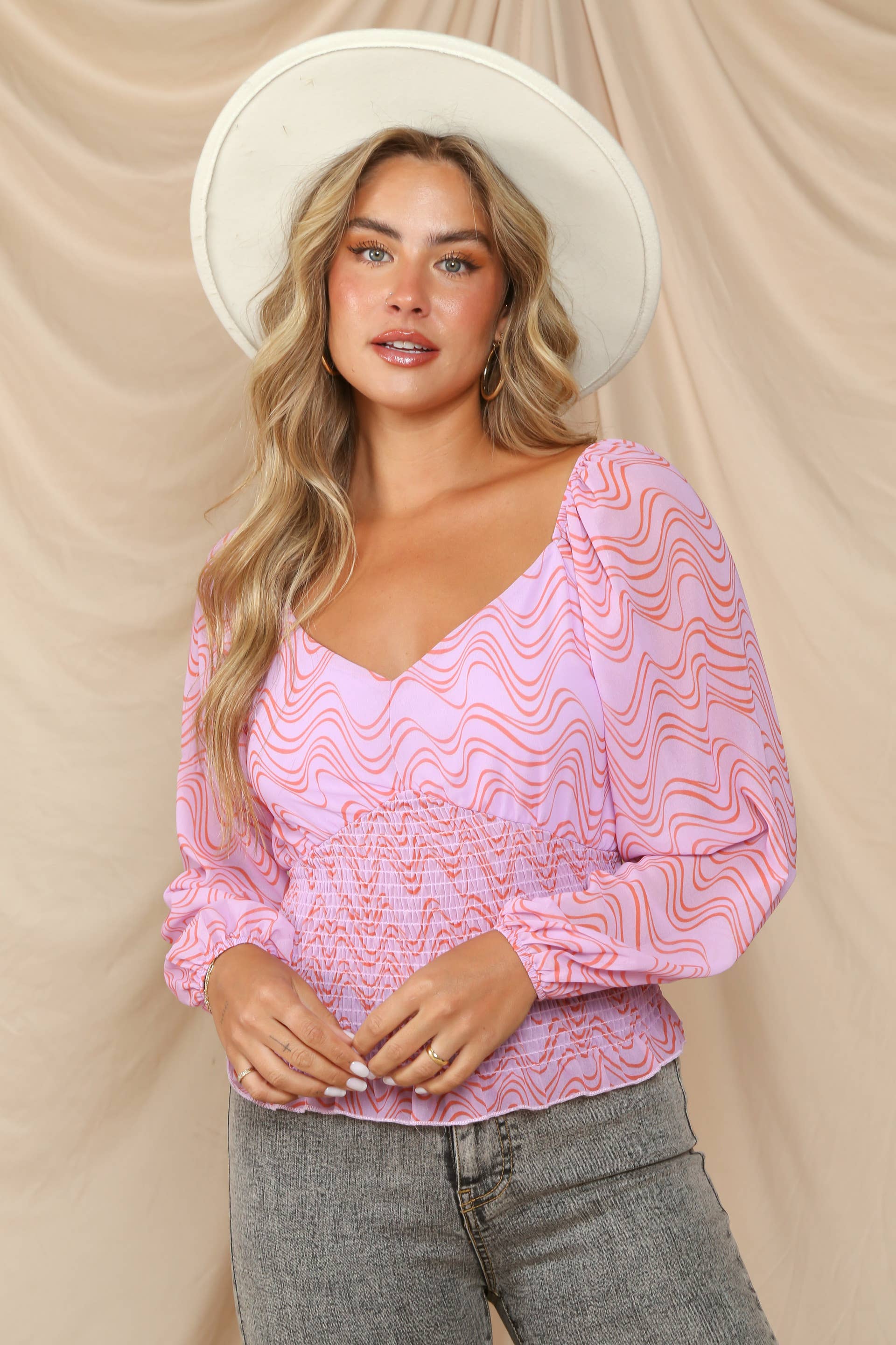 Wave Print Smocked Chiffon Blouse