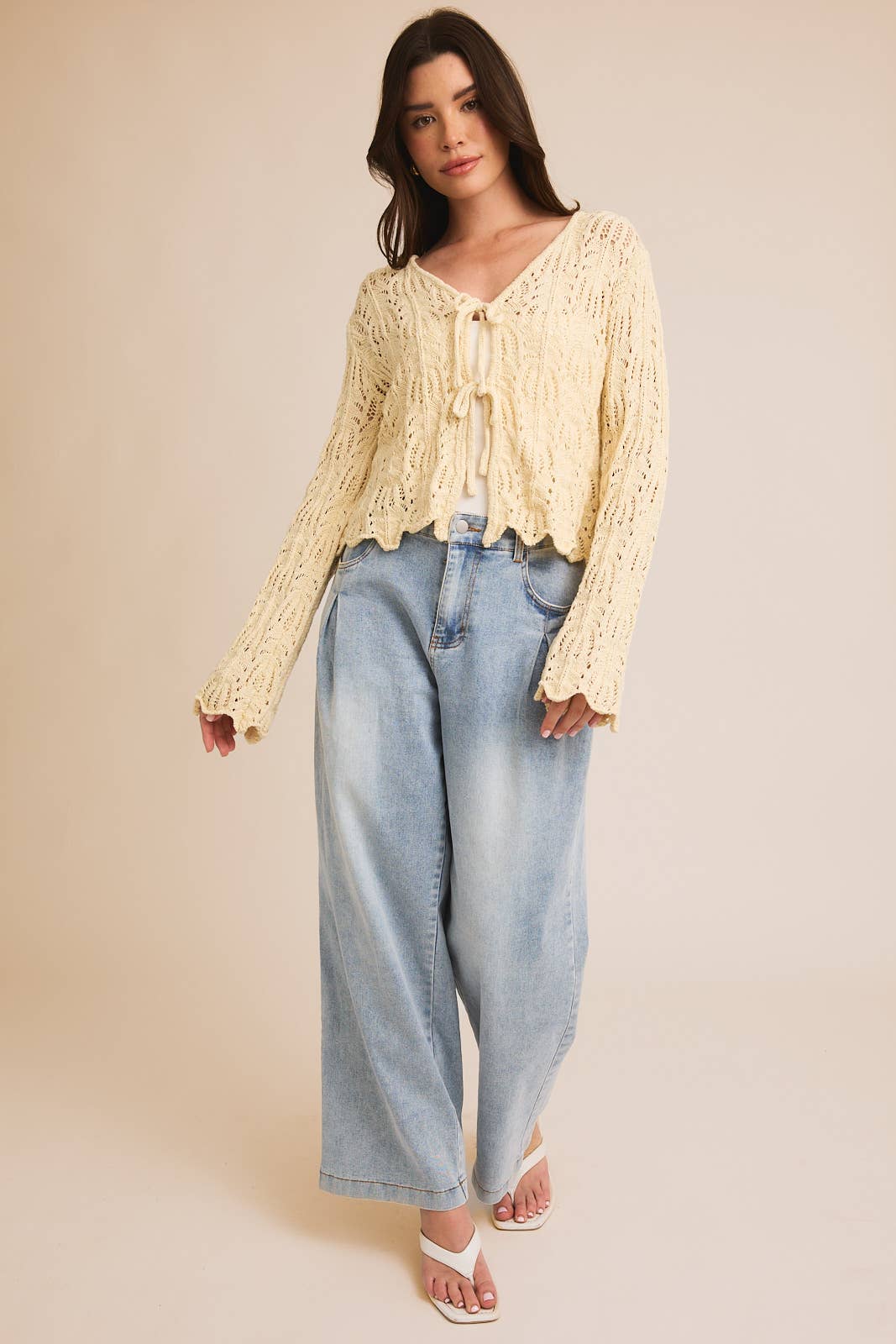 FRONT TIE BELL SLEEVE OPEN KNIT CARDIGAN