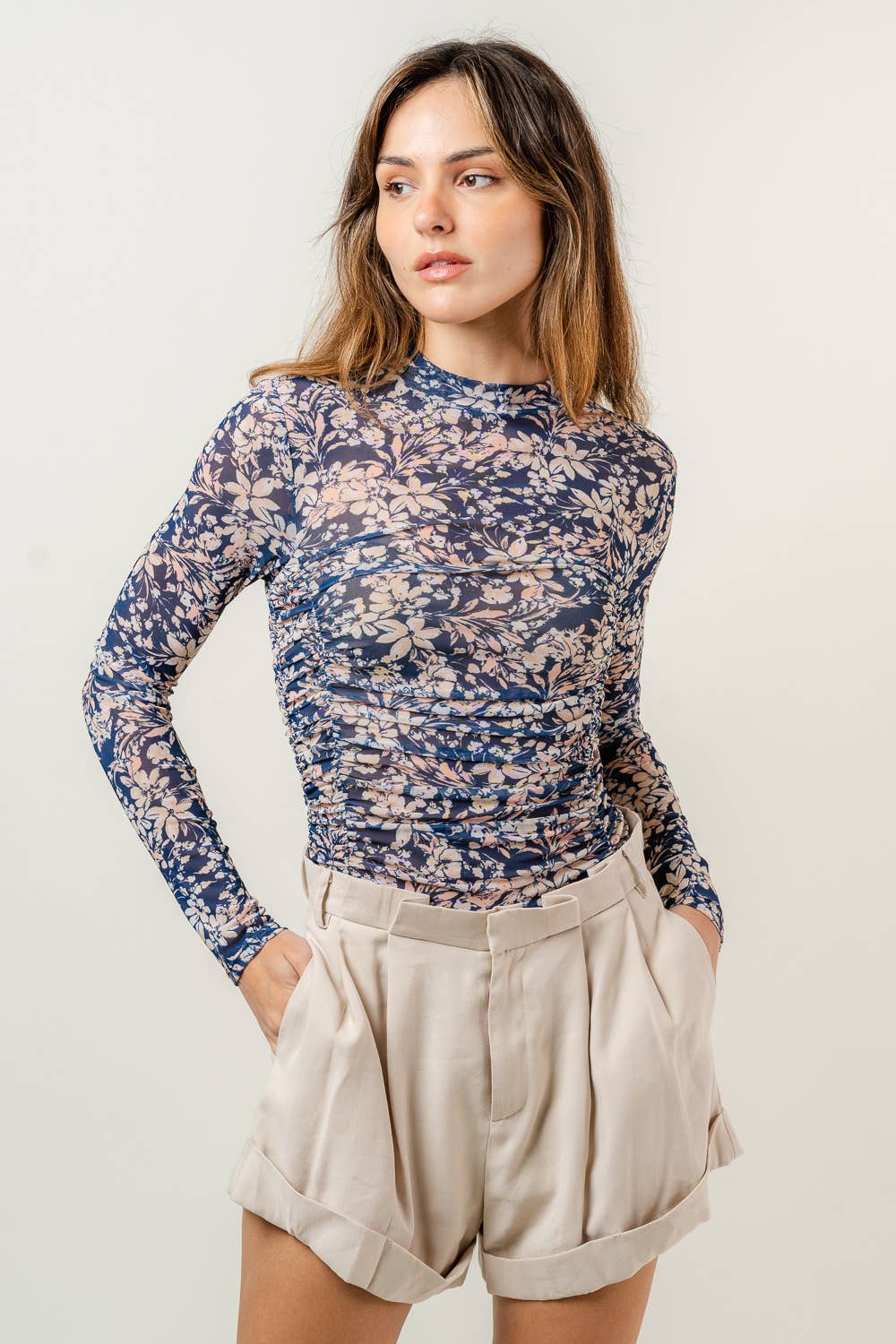 LOW TURTLE NECK LONG SLV RUCHED MESH BODYSUIT- PD6401FO