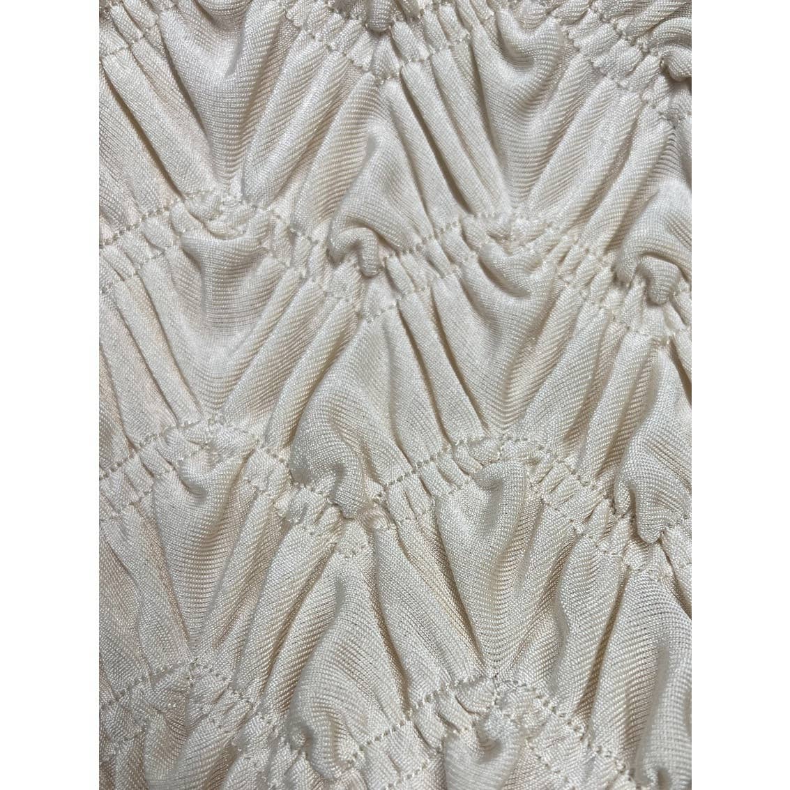 Embrace charm with this lovely smocked knit top. The intricate smocked detailing adds a touch of elegance, making it a delightful choice for a stylish and comforatble ensemble. This novelty fabric adds you a shiny moment.