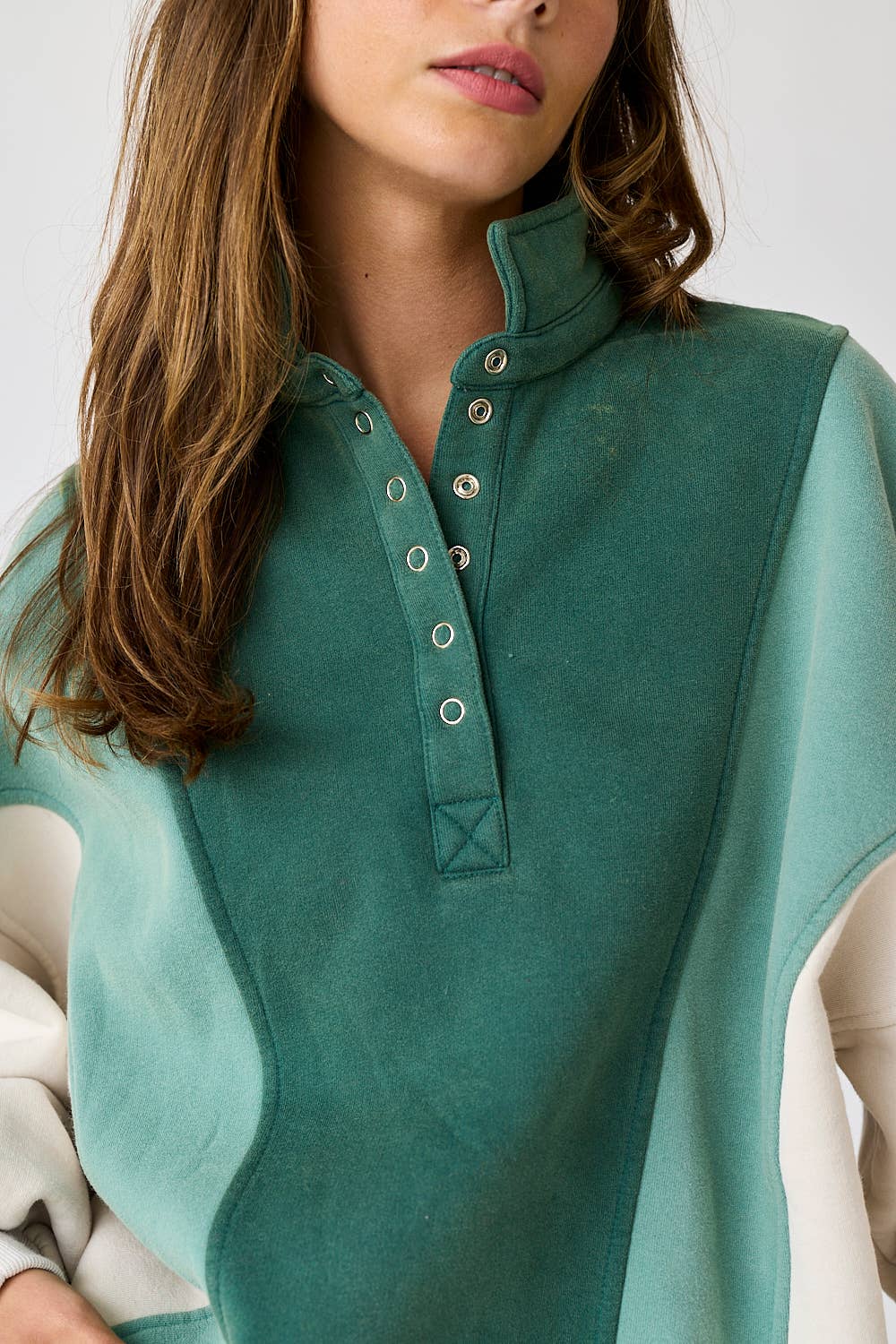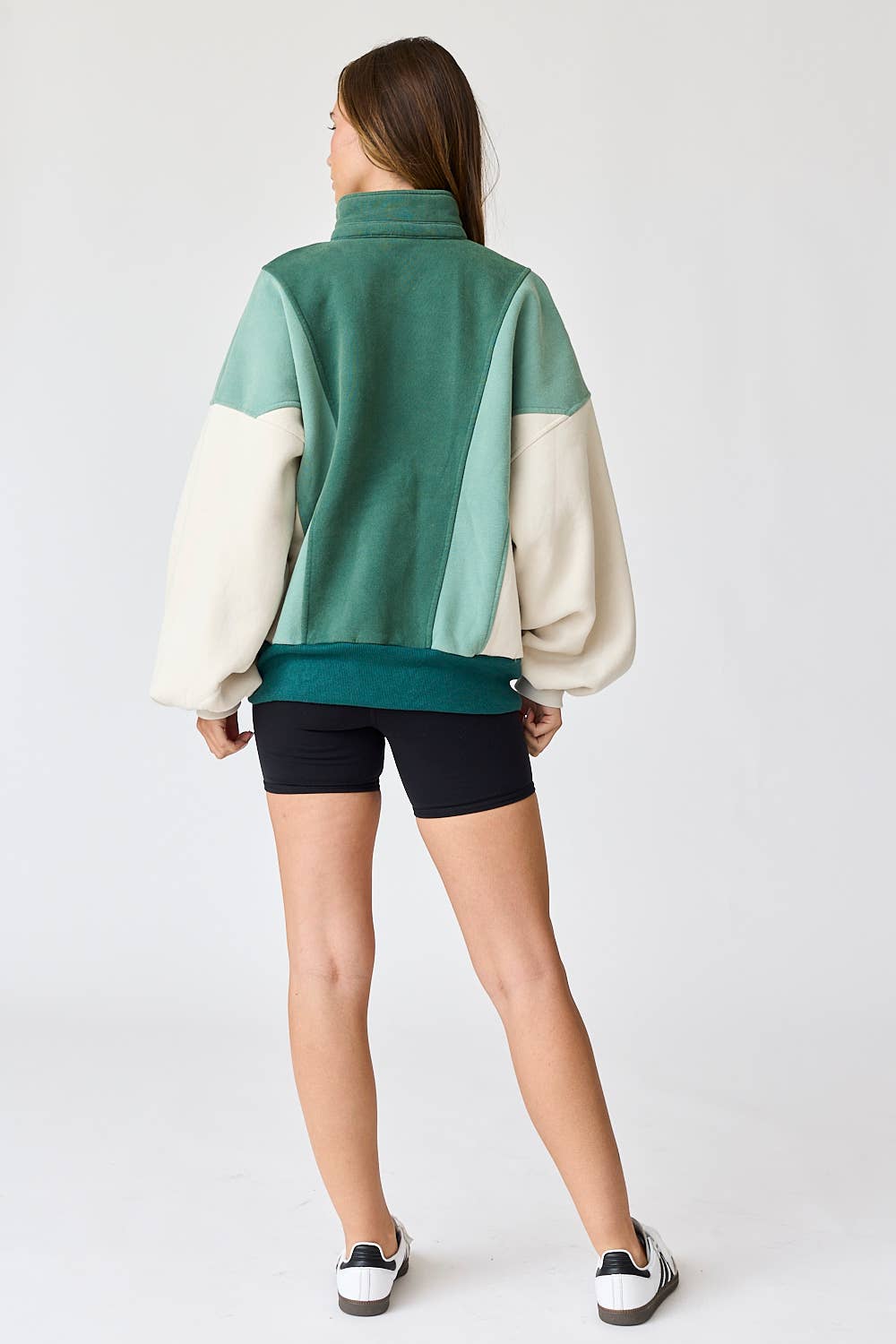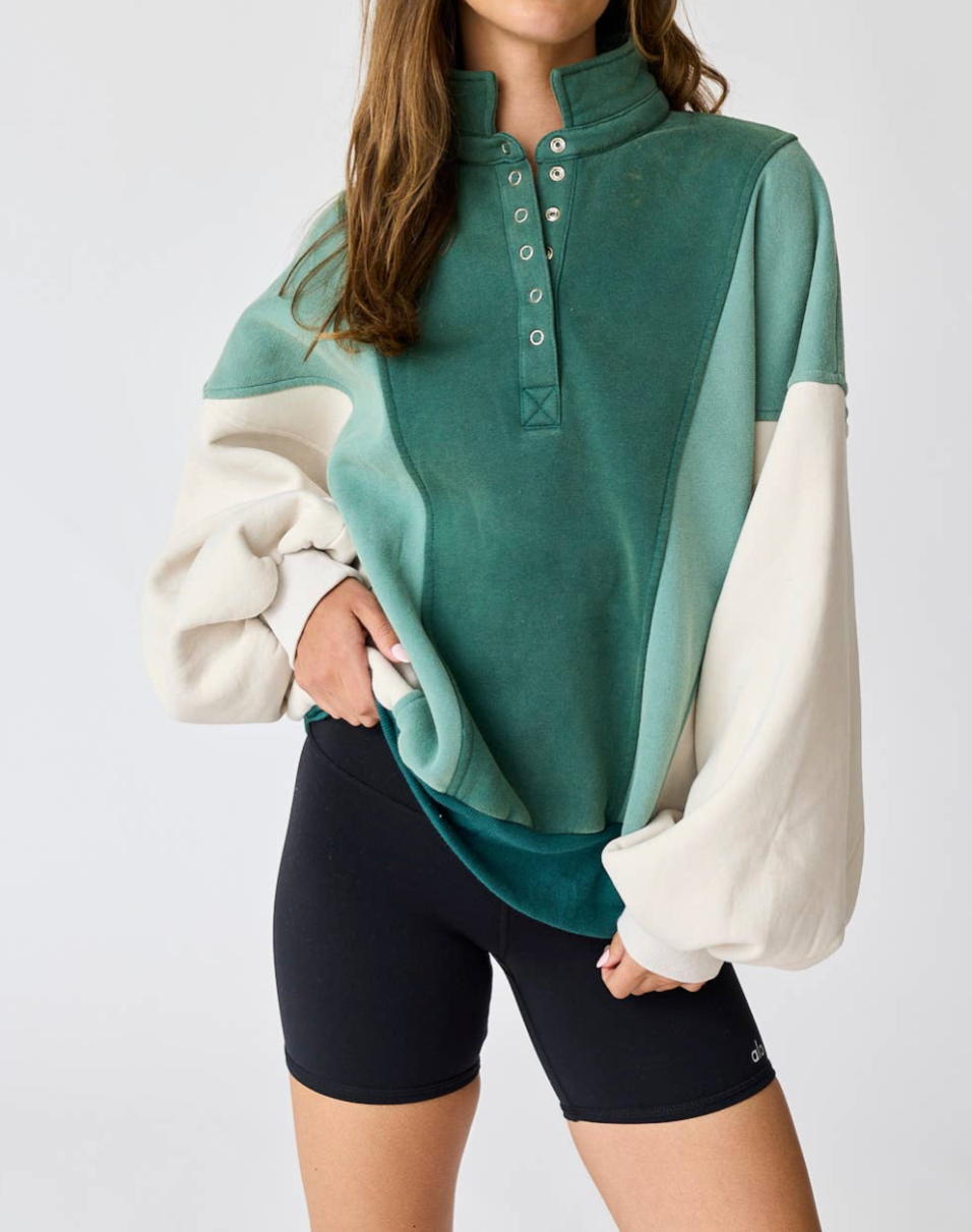 The Emma Regular Length Oversized Washed Green Colorblock Sweatshirt features a relaxed fit, making it perfect for casual, comfortable wear. Its soft, washed fabric offers a vintage look, while the colorblock design incorporates various shades of green for a modern and stylish flair. The oversized silhouette provides ample room for layering, and the ribbed cuffs and hem enhance its snug feel. This versatile piece pairs well with jeans or leggings, making it a staple for cozy, laid-back outfits.