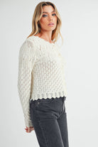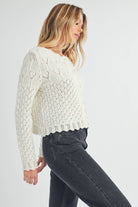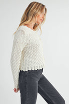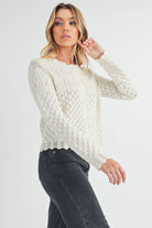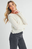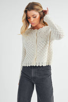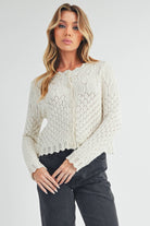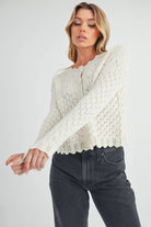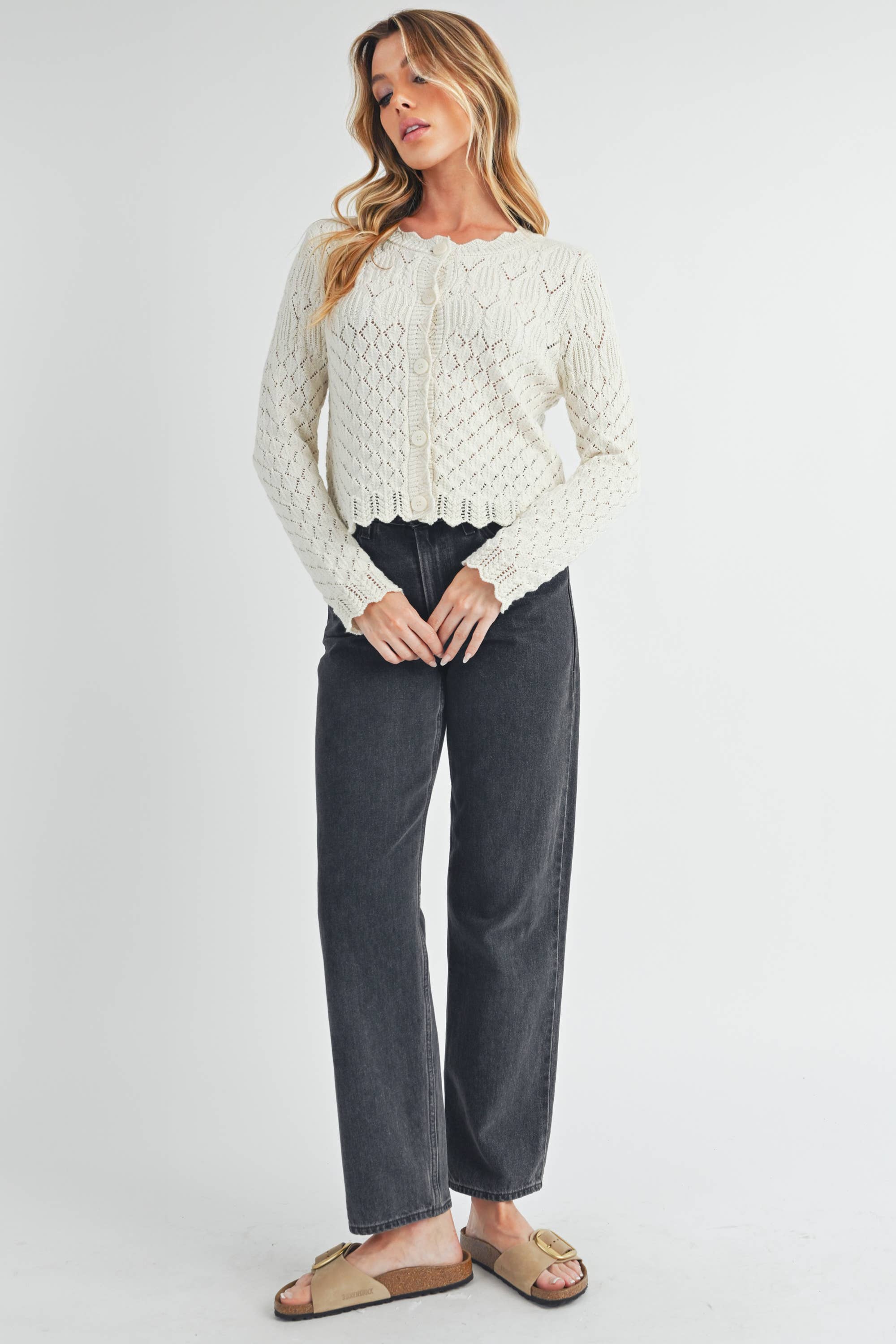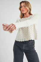 Our Yvonne cardigan complements any outfit effortlessly. Designed with half sleeves, a round neckline, and a cropped, slightly loose fit, this knit cardigan features chic transparent pointelle patterns and delicate scallops on the collar, armholes, and hem. Perfect for pairing with jeans or dressing up for special occasions.