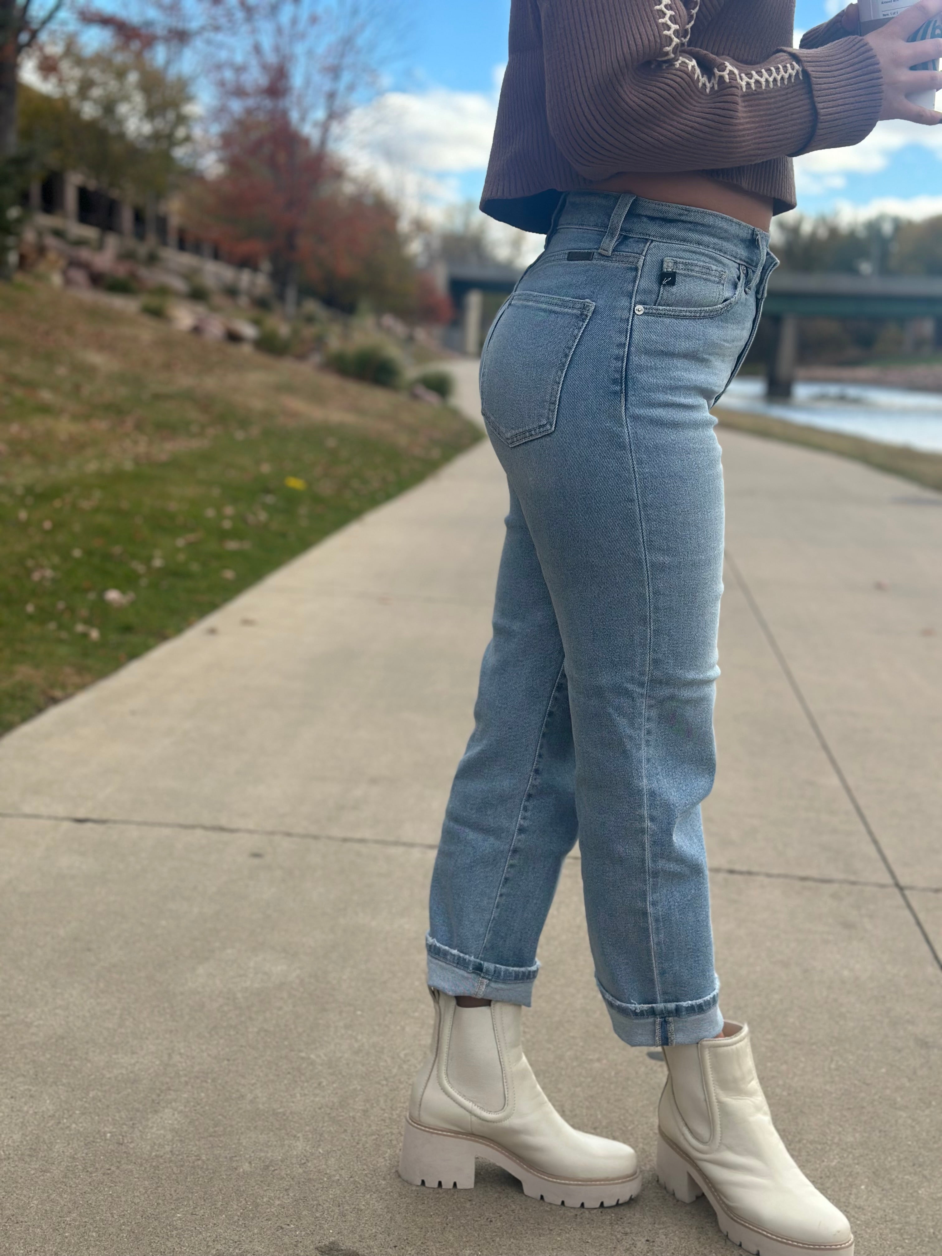 Our high rise skinny made with our well-known jelly fabric that is full of stretch & comfort. Detailed with knee blowouts and a shark bite hem.