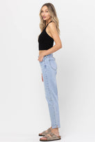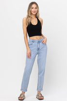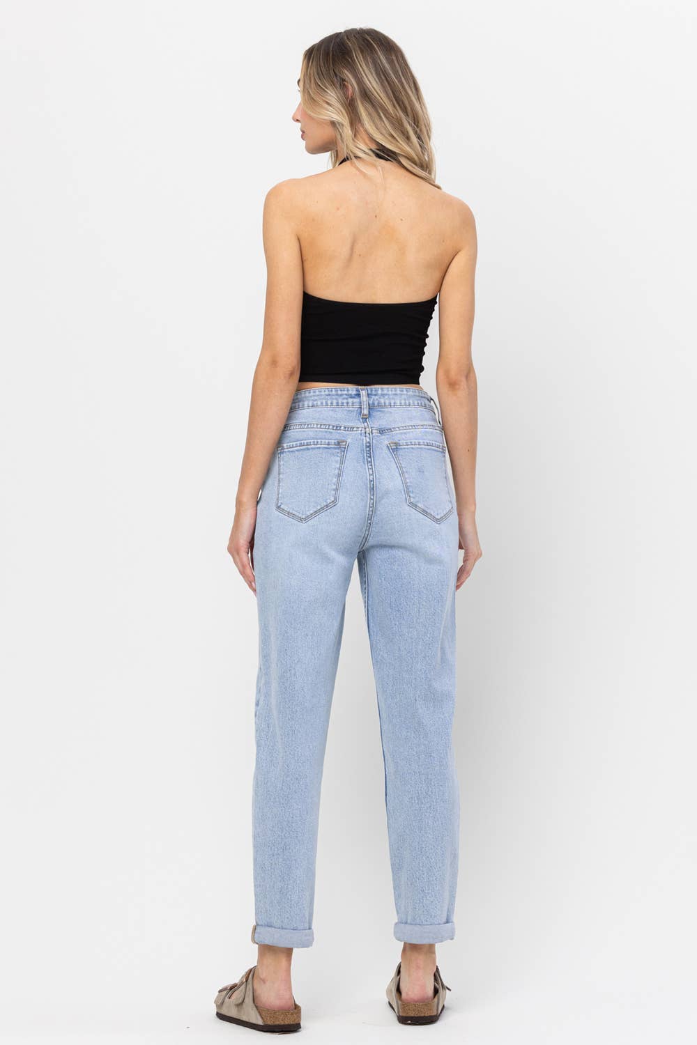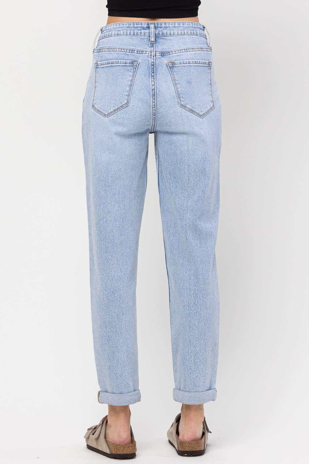 We are loving all the details with this high rise mom jean! With the detail cuff & no distressing, these jeans are simple & made with our well-known jelly fabric giving you the stretch & comfort you know & love. Giving you that worn-in-soft feel & flattering every curve with a relaxed fit.